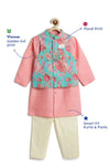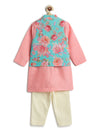 For the little gentleman who loves a pop of color, this floral Bundi set is all about effortless style. The soft pink kurta pops beautifully from under a blue floral Bundi tailored to perfection. Comes with a matching pocket square. Ideal for weddings, festivals, and family events.
