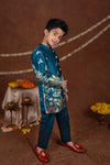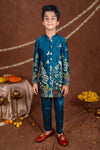 Dress your little one in timeless elegance with this Teal Blue Peacock Sherwani Set for Boys. Featuring exquisite embroidery of majestic peacocks and forest elements, this sherwani brings together rich tradition and festive flair. The structured silhouette is paired with matching straight-fit trousers, making it a perfect choice for weddings, festivals, or formal occasions. Finished with metallic style buttons and crafted in a luxe fabric, this set adds a regal charm to any celebration.
