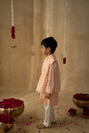 ELEGANT PEACH KURTA CRAFTED IN SOFT MUSLIN PAIRED WITH A BEAUTIFULLY EMBELLISHED CHANDERI JACKET FEATURING GOTA CHAKRI MOTIFS .