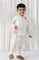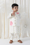Dress him like a little prince in this elegant 3-piece Bundi set, perfect for weddings, festive gatherings, or family functions. The kurta features a subtle buta print, while the Bundi jacket steals the spotlight with delicate rose embroidery in soft hues. Paired with classic cream pants for a clean look.