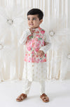 For the little gentleman who loves color, this floral Bundi set is all about effortless style. The soft viscose cream kurta features rose motifs foil print beautifully from under a cream floral Bundi tailored to perfection. Comes with a matching pocket square. Ideal for weddings, festivals, and family events.