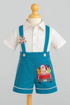 Teal dungaree-style shorts with cute animal motifs and matching white shirt — cheerful and fun, perfect for little explorers.