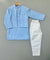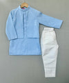 This elegant light blue denim kurta set is a perfect blend of comfort and style for festive and special occasions. The set includes a straight-cut kurta adorned with delicate sequin detailing, paired with am attched smart mandarin-collar jacket overlay that adds a modern touch. Completing the look are crisp white pants with an easy elastic waistband, ensuring both style and ease of wear. A refined outfit choice for celebrations, weddings, or family gatherings.