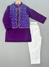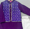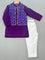 Make your little one shine in this vibrant purple kurta set, designed for festive and special occasions. The set features a solid purple silk kurta paired with a beautifully printed bandhni jacket embellished with sequin detailing and wooden buttons, adding charm and elegance. The crisp white pants with an elastic waistband complete the look, ensuring comfort with style. A perfect choice for weddings, festivals, and family celebrations.
