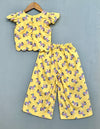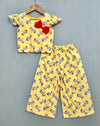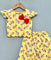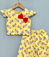 This vibrant co-ord set features a soft cotton fabric adorned with playful, colorful zebra prints, perfect for brightening up any day. The top has ruffled cap sleeves and a scalloped hem for added charm, highlighted by a bold red bow on the front. Paired with matching wide-leg pants with an elastic waistband for comfort, this set is ideal for casual outings or fun gatherings.