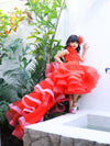 Red colour embroidered dress with corset wires at waist to give corset look.