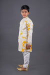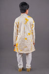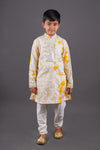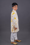 Yellow sherwani with elephant embroidery. Sherwani with asymmetric hem. Sherwani with hook closure at front. Off- White dhoti with elastic at waist.