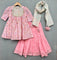 Pink Printed Matching Kurti and Sharara Set with dupatta. Kurti enhanced with all over gold zari lace and yoke cut. Flaired Sharara in matching pink and zari lace at the hem