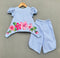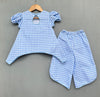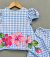Checks Co-ord set with floral applique embroidery embellished with sequins. Stylish round cut at the hem. Ankle length matching palazzo pants with contrast piping