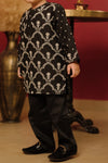 Black kurta set with beautiful embroidery and front button opening. Black straight fit pants with elasticated waist.