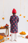 FEATURING VIBRANT RED AND BLUE ANAR FLORAL MOTIFS INSPIRED BY TRADITIONAL FESTIVE ART .THE KURTA IS DETAILED WITH A BUTTONED PLACKET AND CONTRAST BORDER ON SLEEVES.