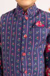 The navy blue floral jacket set features full sleeved kurta with white pyjamas and stripes buti printed jacket with a complimentary pocket square.