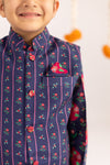 This jacket set includes a plain solid navy blue kurta and stripes small buti floral jacket set wih white pyjamas.