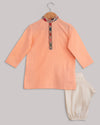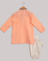 Asymmetrical mughal print multicolour jacket with peach khadi linen kurta and a cotton silk churidar.