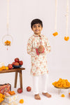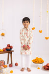 FEATURING VIBRANT IVORY ANAR FLORAL MOTIFS INSPIRED BY TRADITIONAL FESTIVE ART .THE KURTA IS DETAILED WITH A BUTTONED PLACKET AND CONTRAST BORDER ON SLEEVES.