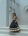 Turn heads at every celebration with this elegant Black Embroidered Lehenga Choli Set. The choli features delicate embroidery, lined with soft cotton for all-day comfort, and is designed with a round neck and secure back hook-eye closure. Playful dori and tassels at the back add a charming finish. Paired with a matching black lehenga, enhanced with lace detailing and cute tassels on the waistline, this outfit strikes the perfect balance between festive glamour and kid-friendly ease.