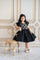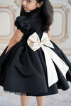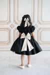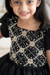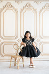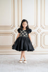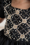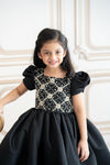 Luxurious Black bridal satin dress with intricate gold embroidery, and puffed sleeves