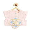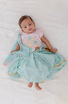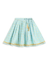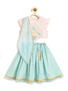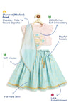 A little tradition, a little twirl! The pastel pink blouse features delicate Laxmi feet and lotus motifs. It is paired with a sky blue lehenga for a soft, soothing colour palette. The golden foil print on the skirt adds just the right hint of festive sparkle. Made entirely from soft viscose for a breezy, comfortable feel, the set is complete with a matching chiffon dupatta for that perfect finishing touch.