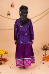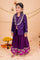 The purple embroidered jacket features intricate parrot motifs and vibrant multicolored bandhani patterns, adorned with delicate zari and gota embroidery along the collar and cuffs. The matching sharara bottoms complement the jacket with their wide-legged, flowing silhouette and elegant border design in silver, gold and pink, with gota and sequin embroidery, adding grace and charm to the overall ensemble. This set effortlessly blends classic Indian aesthetics with modern style.
