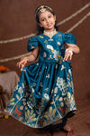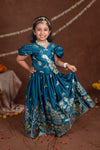 Grace meets tradition in this stunning Teal Blue Peacock Lehenga Set for Girls, perfect for festive occasions and weddings. The pleated cap-sleeve blouse and flared skirt are beautifully adorned with intricate embroidery featuring peacocks, trees, and forest-inspired motifs in rich, vibrant threads and soft luxurious satin. The luxurious fabric and elegant silhouette add a royal charm. A charming and comfortable choice for celebrations with a touch of heritage flair.