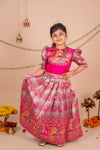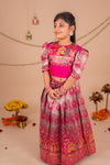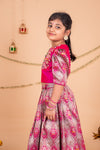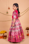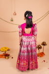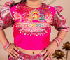 This Lehenga set is a celebration of color, culture, and craftsmanship. The hot pink blouse features intricate brocade fabric adorned with a vibrant wedding scene – showcasing elephants, dancers, and the groom’s procession in regal detail with a back cutout adding to the style. Embellished with pearls, puffed brocade sleeves add a playful yet royal touch. This ensemble brings a royal Indian wedding to life. Perfect for weddings and festivities.