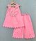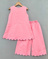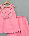 This adorable co-ord set combines elegance with comfort, making it ideal for any occasion. The sleeveless top features a beautifully hand embroidered neckline adorned with delicate floral detailing and a scalloped hem, adding a charming touch. The matching pants have a relaxed fit and also feature scalloped edges, creating a cohesive look. Crafted from soft, breathable fabric, this set ensures all-day comfort while maintaining a stylish, coordinated appearance for your little one.