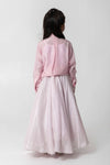 ELEVATE YOUR FESTIVE WARDROBE WITH THIS ULTRA-CHIC PINK TIE-UP SHIRT AND SHIMMERY MATCHING SKIRT SET. THE TIE-UP SHIRT IN SILK FEATURES INTRICATE BUTTERFLY EMBROIDERY