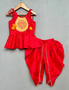This stylish red dhoti set for girls includes a sleeveless peplum-style top adorned with intricate embroidery and sequin details, along with playful yellow floral net embellishments. Paired with a matching dhoti pant featuring a zig-zag lace trim along the edges, this set combines traditional charm with a modern silhouette. Perfect for festive gatherings and cultural events, this outfit is designed for comfort and flair, making it an ideal choice for little fashionistas.
