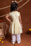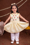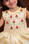 Let your little one step into the season of fun with this Watermelon Motif Frock Set. Crafted in a soft pastel yellow base, the frock features hand-embroidered watermelon slices in a playful grid with light frills, adding a juicy splash of charm. The frilly sleeves and gathered waist create a silhouette that’s both classic and comfortable for all-day wear. Paired with crisp white straight pants detailed with contrast thread lines at the cuffs, this ensemble is perfect for festive occasions, fruit-themed events, or just a breezy summer day.