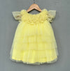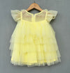 This charming yellow dress showcases a beautifully crafted floral bodice with delicate ruffle detailing in net and soft, sheer cap sleeves. The layered tulle design adds volume and elegance, making it perfect for any special occasion.