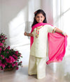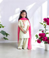 Brighten up your little one's festive look with our Green Mukesh Work Suit Set, perfect for special celebrations. This lightweight and elegant outfit features a green Mukesh work kurti with a cotton lining, a round neck, and back button closure, finished with delicate lace details. It is paired with Mukesh work pants and a pink georgette lehriya dupatta, edged with lace. Festive styles never go out of style.