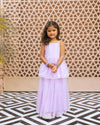 Dress your little one in sheer elegance with this lilac embroidered organza Kurti Sharara set. The Kurti, beautifully adorned with Cut Dana embroidery and lined with soft cotton, pairs perfectly with an intricately embroidered Sharara. Finished with delicate lace detailing, this dreamy ensemble is perfect for weddings, festivals, and special celebrations!