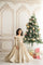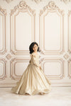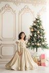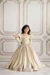 A full-length golden gown featuring a meticulously hand-embroidered bodice and full sleeves.