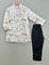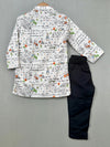 This adorable kurta set for boys features a playful bunny-themed print with charming text details on the white kurta, paired with classic black pants. The mandarin collar and wooden buttons add a touch of traditional elegance, making it perfect for both casual and festive occasions.