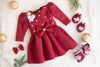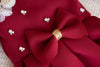 A maroon scuba dress with box pleats, featuring full sleeves adorned with hand embroidered flowers, pearls and stones. Completed with matching mittens and shoes.