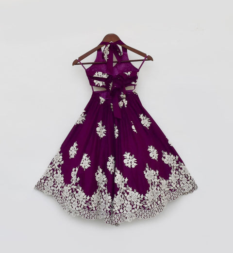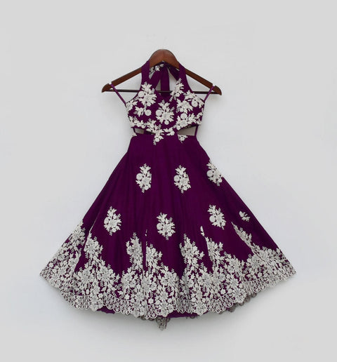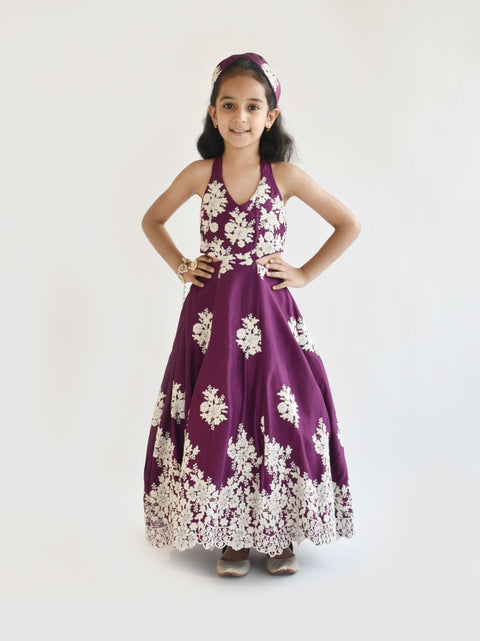 Cotton Wine embroidery one piece gown, with white embroidery work. A signature of rich and royal pick. Floor Length One Piece Gown with soft lining Halter Neck Style Back tie...