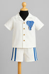 A stylish white shirt and shorts set with a bold blue elephant motif and matching striped shorts, giving a sporty yet trendy look.