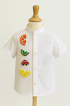 The shirt has a Mandarin collar (also known as a band collar) and buttons down the front. The design is cheerful and fun, The bright fruit and car motifs give the shirt a whimsical and youthful look.
