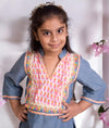Refresh your little one's wardrobe with our Blue Denim Kurti with Pant Set for girls. This chic set features a denim kurti designed without lining for a lightweight, breathable feel. It showcases a stylish V-neck and vibrant print on the yoke, finished with multi-colored laces for a playful touch. Paired with coordinating denim pants, also finished with matching laces, this outfit combines comfort and style effortlessly. Ideal for any casual or festive occasion, it’s perfect for keeping your child cool and fashionable throughout the day.