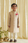 Soft pastels, fine brocades and Tiber Taberβs top tier fit and finish. Made to match the perfection that your little gentleman is. Star of every wedding and all eyes on him is our promise with this Sherwani. Lined with soft viscose for supreme comfort and finished with ornate gold buttons and a pocket square to match. Comes with pants and a kurta.