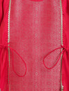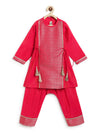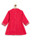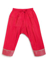 A rich ruby straight-cut kurta featuring a brocade front panel, lace trims and dainty tie-ups on the sides. Paired with a comfy salwar detailed at the hem, it’s fuss-free yet festive. Ideal for weddings, poojas and every celebration that calls for cute royalty!