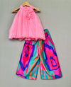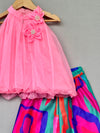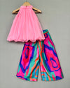 Bring a pop of color to your child’s wardrobe with this chic Indo-western set! The halter-neck pink organza top is detailed with floral appliqué and pearl embellishments, paired with vibrant multicolor palazzo pants in bold abstract prints. Comfortable yet stylish, this outfit is perfect for birthday parties, festive gatherings, and special family occasions.
