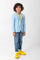 POWDER BLUE BLAZER FEATURING A STRIKING RAINBOW COLLAR AND EYE CATCHING RAINBOW ZEBRA EMBROIDERY