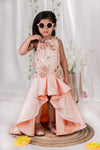 Introducing our enchanting Princess High-Low Dress in the softest shade of peach. Crafted to perfection, the bodice of this gown is adorned with delicate self-embroidered net fabric, intricately detailed with sequined flowers and dense embellishments. Transitioning seamlessly into a high-low silhouette, the dramatic back trail cascades behind you creats an awe-inspiring aura as it gracefully sweeps the floor.
