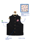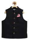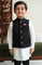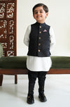 The quintessential black Nehru jacket. Tailored to perfection, it features regal metal buttons and our signature print pocket square. This jacket effortlessly blends classic elegance with modern flair, ensuring a dapper, polished look for your boy.
