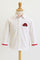 White shirt with red hot car embroidery and racing stripes — for the mini speedster who loves everything fast and fabulous.