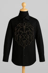 Black button-up shirt featuring an intricate golden embroidered geometric lion face design on the front, symbolizing strength and confidence.