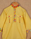 This Yellow Pathan Suit with Printed Patti Details is crafted from the finest material, providing superior comfort and durability. With its stylish prints, this suit is perfect for special occasions or everyday wear.
